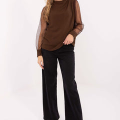 Elegant blouse with a subtle, feminine style, perfect for formal occasions and work. Made of smooth fabric that is a blend of polyester and elastane, providing comfort and gently fitting the silhouette. The blouse has a round neckline, and its decoration is eye-catching, long mesh sleeves that add lightness and elegance. Puffy sleeves with decorative pleats on the shoulders and...