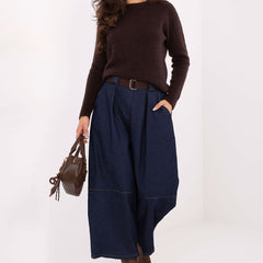 Casual women's culotte jeans, perfect for everyday styling. Made of a blend of cotton and elastane, they provide comfort, freedom of movement, and slight elasticity. The smooth material emphasizes the universal character of the model, making it easy to match the pants to many outfits. The model has a high waist, and an elastic band is sewn in the back...