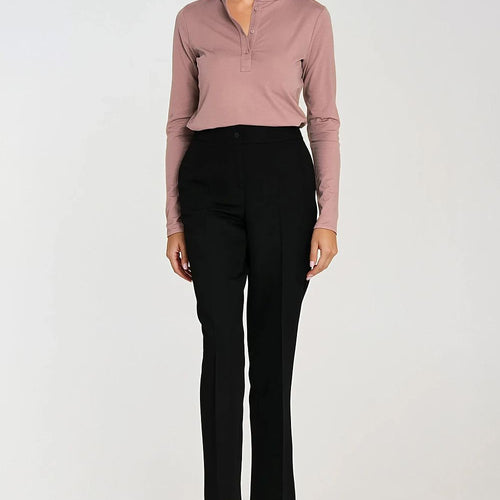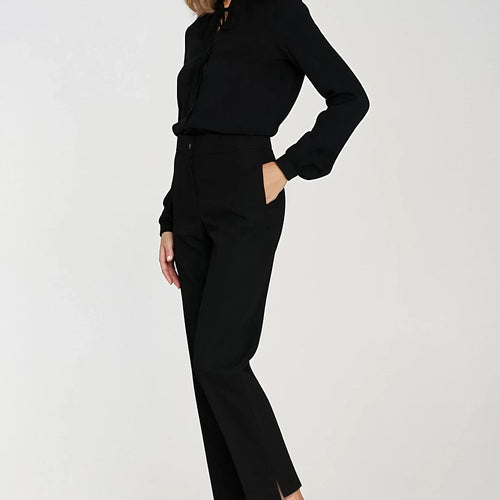 Elegant women's trousers in a fit cut, tailored to the silhouette, made of high-quality material that ensures comfort. The model has a medium waist and tapered leg ending with a subtle slit on the side, adding a modern character. The trousers have pressed creases at the front and back, emphasizing an elegant, classic cut. Zip and button fastening, classic front...