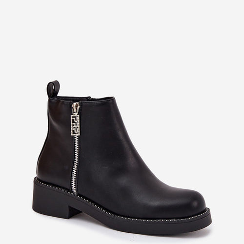 Women's ankle boots made of eco leather are an elegant and comfortable choice for cooler days. Fastened with a zipper. The insulated interior provides warmth, while the rounded toes and delicate heel add a feminine character, ensuring comfort and style for everyday wear. Decorated with zircons at the sole. The silver zipper is decorative and does not unzip. Perfect for...