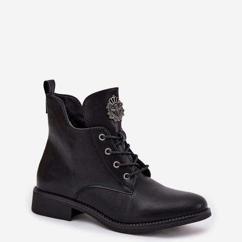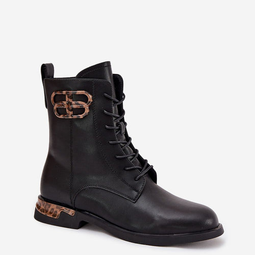 Boots made of eco leather with a flat heel are a perfect choice for cooler days. The model stands out with rounded toes and lacing, decorated with fancy pins that add a unique charm. The interior lined with shoe lining provides warmth and comfort when worn. Practical and fashionable, perfect for everyday styling! fabric artificial leather warmers shoe cover Footbed...