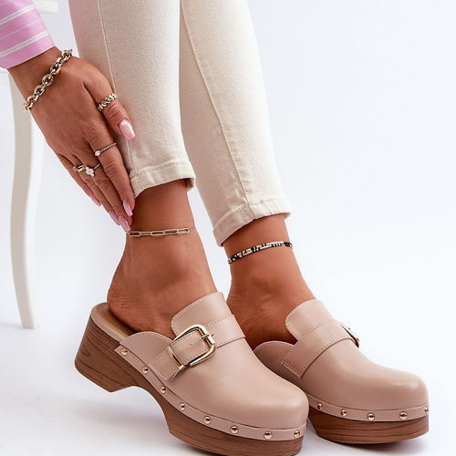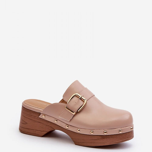 Lightweight flip-flops set on a heel and platform, which gives them a subtle expression. On the upper, a strap with buckle and decorative studs around the sole. Made of eco leather, both the upper and the insole guarantee durability and wearing comfort. This model goes well with everyday styling, adding a note of chic and sophistication. fabric artificial leather Footbed...