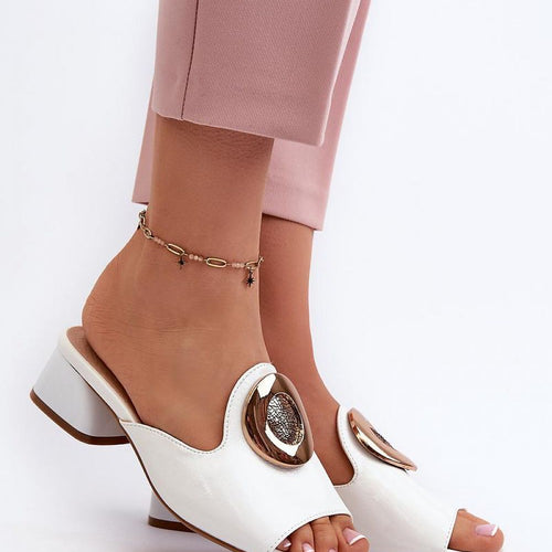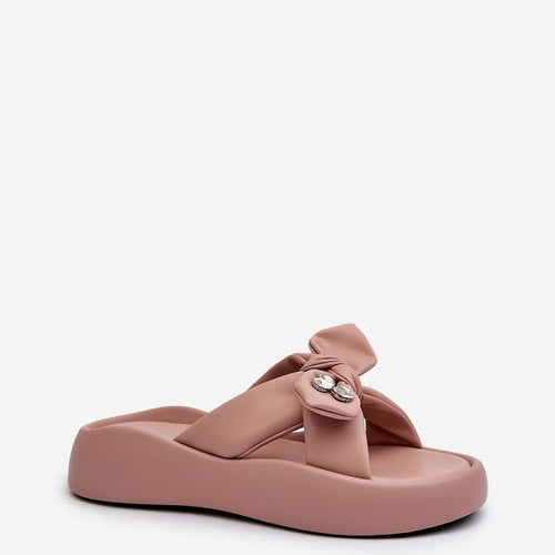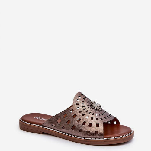 Women's flip-flops by Jezzi. Made of eco leather. Gold ornamentation adds elegance and subtlety. They are perfect for both summer walks and evening outings. Thanks to the low heel, you can feel comfortable in them all day long, and at the same time they look very feminine and fashionable. Perfect for a variety of occasions, these flip-flops will add glamour...