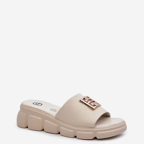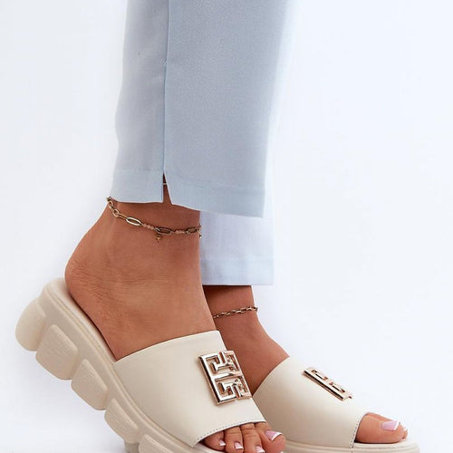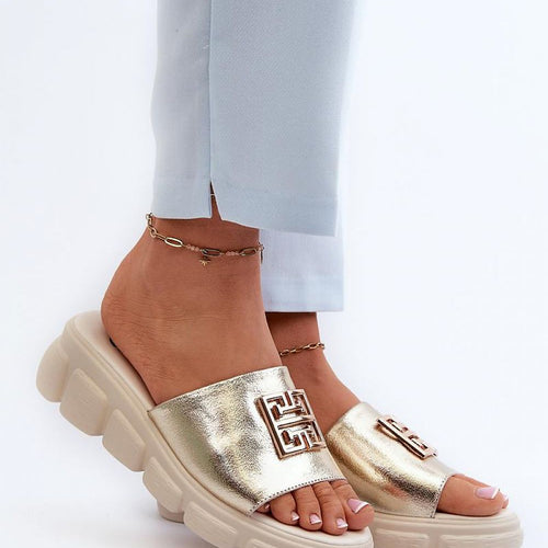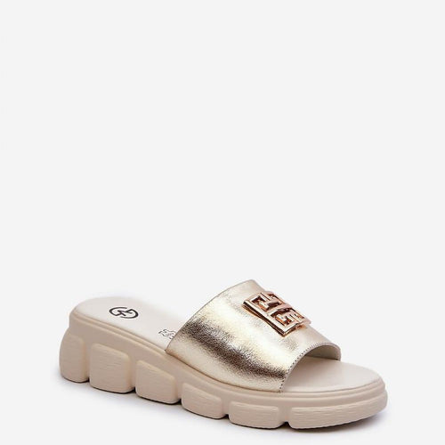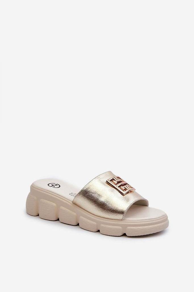 Women's slides by Vinceza. Set on a wedge heel for stability and comfort during wear. Made of genuine leather. The gold ornament at the front adds a subtle shine. A lightweight design that not only accentuates your outfit but also adds a touch of elegance. fabric natural leather Footbed artificial leather Heel height 5 cm Platform height 2.5 cm Size...