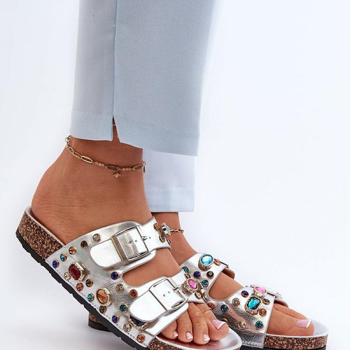 S.Barski brand flip flops made of faux leather. Adorned with sparkling crystals, they add sparkle to any outfit. Set on a cork platform, they provide stability and a trendy look. At the front, there are two adjustable straps with buckles, ensuring a perfect fit. These shoes not only catch the eye with their unique design, but also provide comfort while...