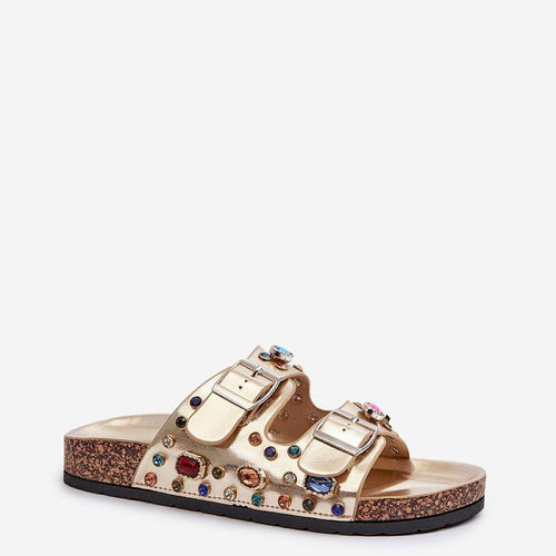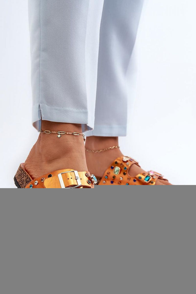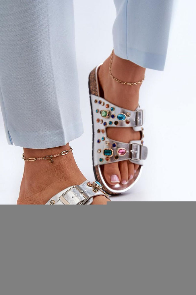 S.Barski brand flip flops made of eco leather. Decorated with sparkling crystals, they add glamour to every outfit. Set on a cork platform, they provide stability and a trendy look. At the front, there are two adjustable straps with buckles, ensuring a perfect fit. This footwear not only catches the eye with its unique design but also provides comfort while...