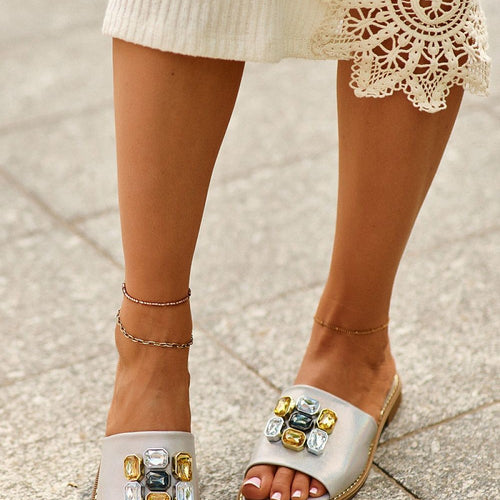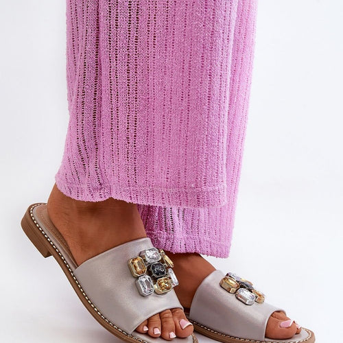 Women's flip-flops on a flat heel with decorations. Made of high quality materials. Soft leather insole will ensure comfortable wearing all day long. Elegant design makes them an ideal choice for various occasions. fabric artificial leather Footbed natural leather Heel height 1.5 cm Size Insole lenght 36 24 cm 37 24.5 cm 38 25 cm 39 25.5 cm 40 26...