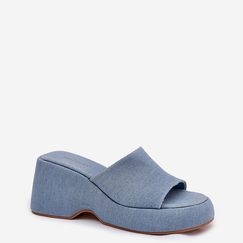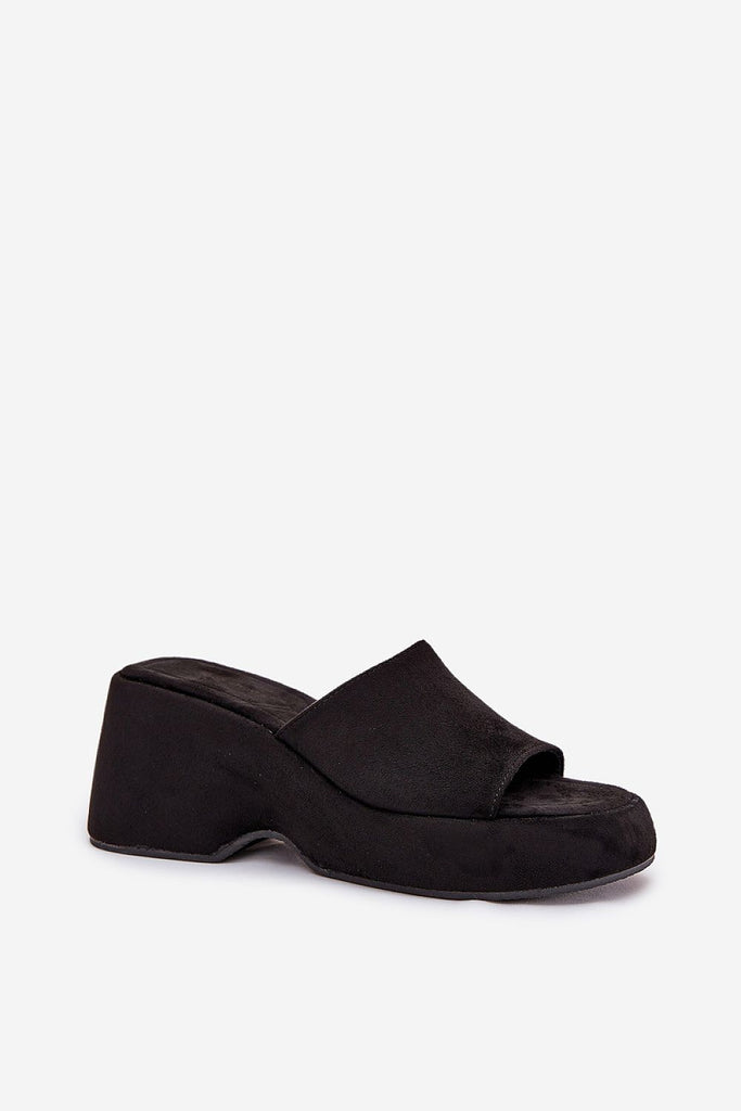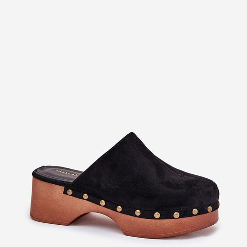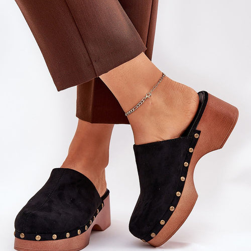 Light women's clogs made of eco suede. Set on a platform and wedge heel. Decorated with studs that give them a fashionable and unique character. Inside there is a soft eco leather insole, which guarantees comfort all day long. The clogs have covered, rounded toes. Perfect for everyday wear, they go perfectly with summer dresses, skirts, and trousers. fabric imitation...