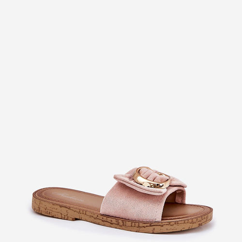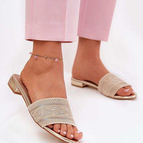 Flat women's slippers made of eco suede, combining comfort with subtle style. Decorated with a gold detail at the front, adding elegance and a unique character. Perfect for warm days, these slippers go perfectly with summer dresses, skirts or pants, adding lightness to any outfit. fabric imitation leather suede Footbed artificial leather Heel height 1.5 cm Size Insole lenght 36...