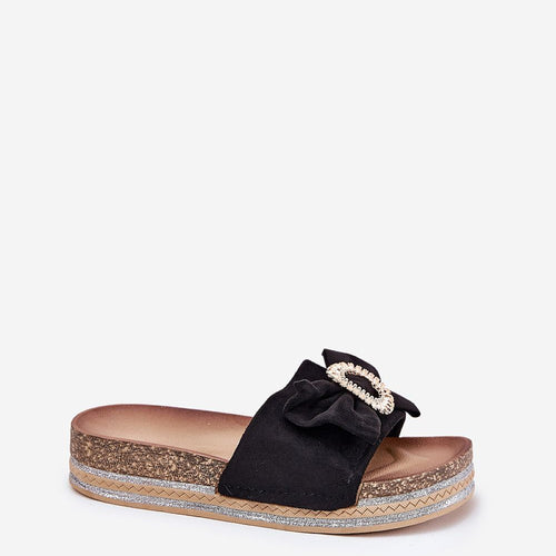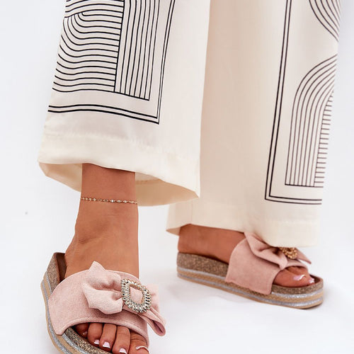 Slippers made of eco suede. In the front there is a bow and a decorative brooch. Set on a platform with glitter, which adds a bit of shine and elegance to every outfit. These slippers will be a perfect choice for summer days, perfectly matching with dresses, skirts or shorts, adding a modern touch to every look. fabric imitation leather...