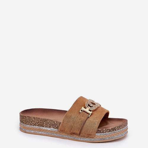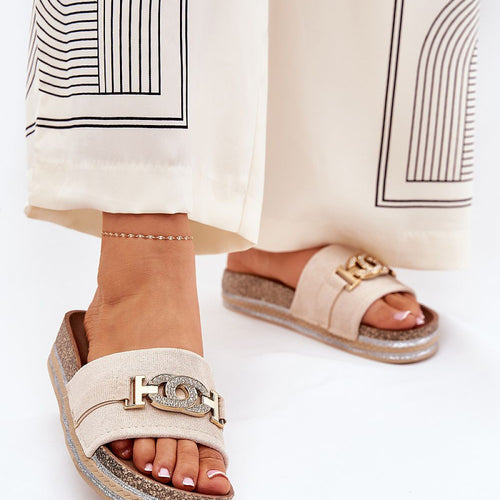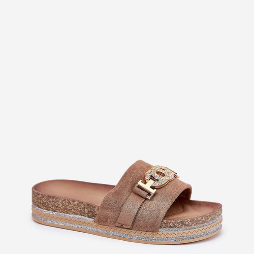 Slides made of eco-suede. At the front, there is a decorative gold detail that gives them a unique character. Set on a platform with sequins, which adds a bit of shine and elegance to every outfit. These slides will be a perfect choice for summer days, perfectly complementing dresses, skirts or shorts, adding a modern touch to every look. fabric...