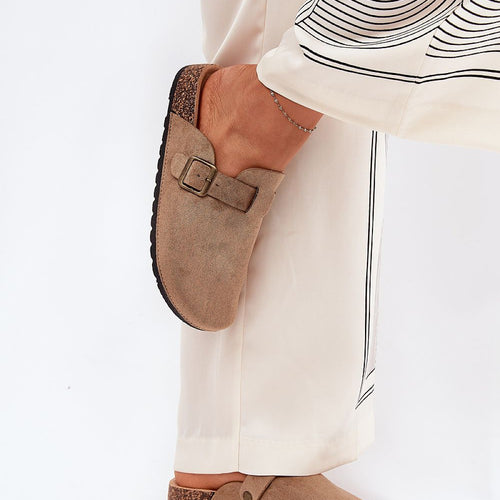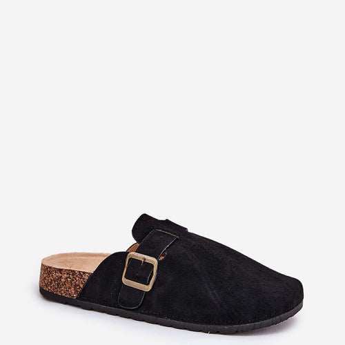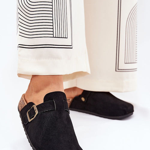 Women's cork platform clogs. Made of eco suede. Covered toes provide greater protection, and the buckle allows for a perfect fit to the foot. The profiled insole ensures comfort throughout the day, providing proper support. These clogs will be an excellent choice for everyday wear, perfect for casual styling, providing comfort and a trendy look. fabric imitation leather suede Footbed...
