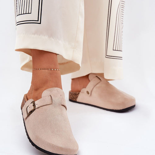 Women's cork platform clogs. Made of eco-suede. Covered toes provide greater protection, and the buckle allows for a perfect fit to the foot. The profiled insole ensures comfort throughout the day, providing proper support. These clogs will be an excellent choice for everyday wear, perfect for casual styling, providing comfort and a fashionable look. fabric imitation leather suede Footbed imitation...