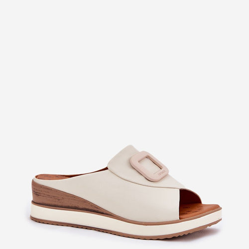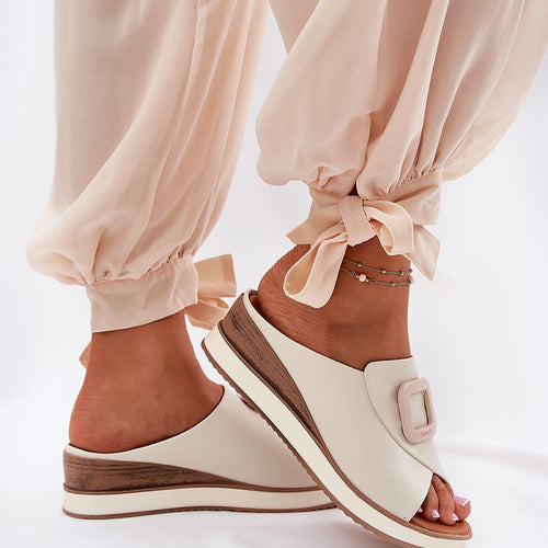 Women's leather slippers are an elegant proposal for warmer days. Set on a wedge, they provide stability and comfort throughout the day. At the front of the shoes, there is a subtle decorative detail that gives them a unique character. The soft insole ensures comfort while wearing, and the stylish design makes the slippers a perfect addition to summer outfits....