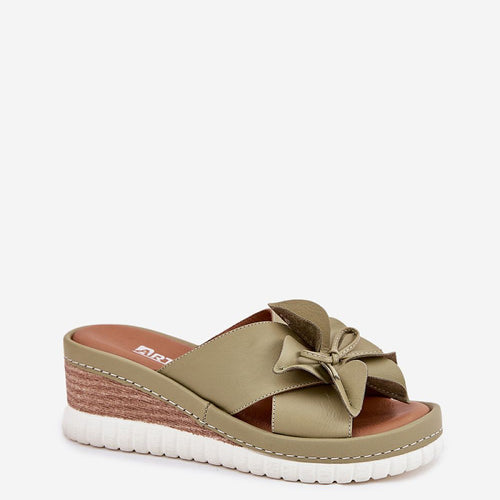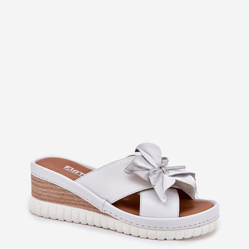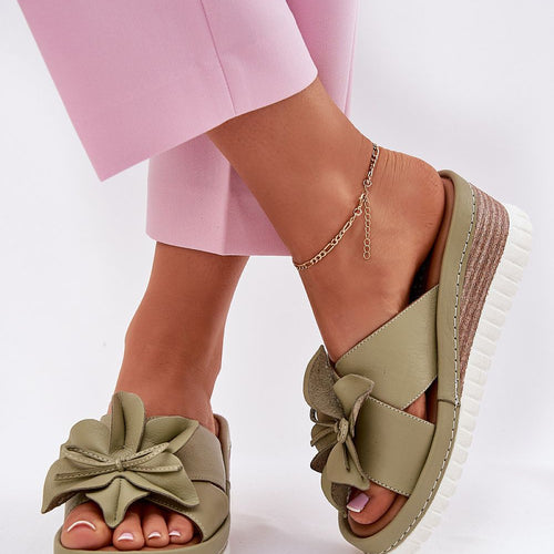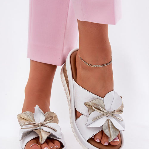 Women's slippers made of high-quality natural leather. Mounted on a wedge heel. There is a subtle decorative flower at the front of the shoe, which adds a unique character. The very soft insole provides comfort throughout the day, making these slippers an ideal choice for summer stylizations, combining functionality with a stylish look. fabric natural leather Footbed natural leather Heel...