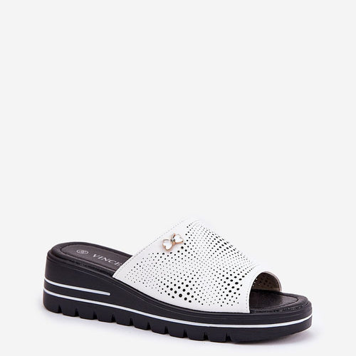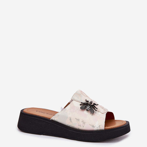 Women's slippers from the Vinceza brand, made of natural leather, are an elegant option for summer days. This model is distinguished by a subtle decorative brooch that adds a unique character to them. Set on a delicate wedge heel, they provide comfort and stability throughout the day. The leather insole guarantees wearing comfort, making these sandals a perfect complement to...