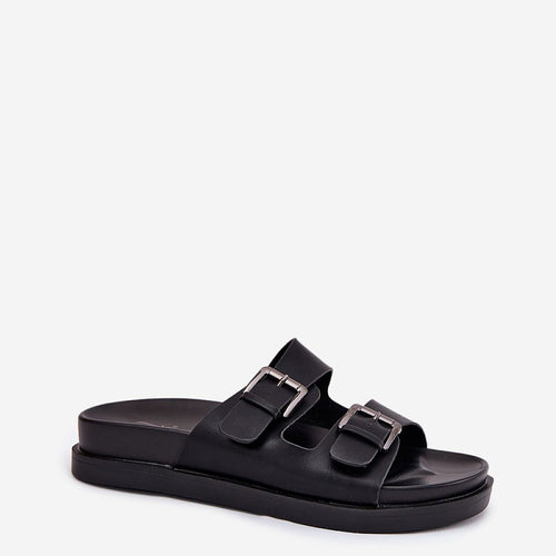 Women's slippers made of eco-leather are a great proposition for everyday outings. Set on a platform, they provide comfort and stability throughout the day. This model is distinguished by eye-catching buckles that give it a modern character. Thanks to the simple yet stylish design, these slippers perfectly complement various summer stylizations, combining functionality with a fashionable look. fabric artificial leather...