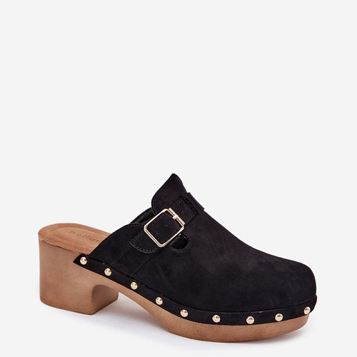 Women's clogs made of eco suede. Set on a block heel. The strap with a gold buckle adds a subtle elegance to them, and the studs on the sole introduce a bit of a rock character. The soft insole provides comfort all day long, making them an ideal choice for everyday styling. fabric imitation leather suede Footbed artificial leather Heel...