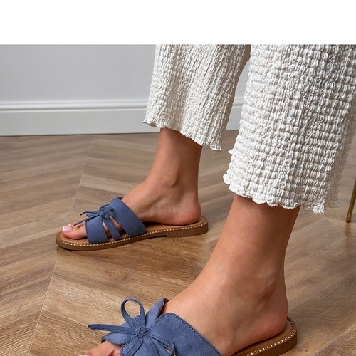 Charming women's sandals in a classic style, made of soft, suede-like eco leather, are a perfect choice for summer. Their unique character is emphasized by a decorative bow placed on the top, which highlights a feminine and subtle style. The eco leather insole ensures comfort during everyday wear. The model is set on a flat heel measuring 1 cm, guaranteeing...