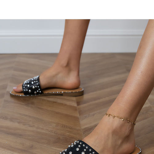 These stylish flip-flops are the perfect combination of simplicity and fashionable details. Made of high-quality eco-leather, they look elegant and modern. Attention is drawn to decorative rhinestones on the strap, which add character and a delicate shine to the shoes. The classic design and flat 1 cm heel ensure comfort for everyday wear. The eco-leather insole is soft and pleasant...