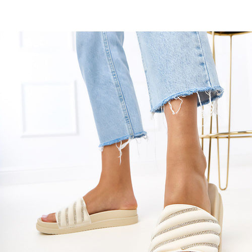 These stylish flip-flops are a combination of comfort and shiny style. Made of a combination of rubber and fabric, they provide comfort and durability, and decorative zircons add an elegant, eye-catching character to them. The slip-on style makes them extremely practical, perfect for a quick exit from home, a walk, or summer meetings. The 4 cm platform delicately lifts the...