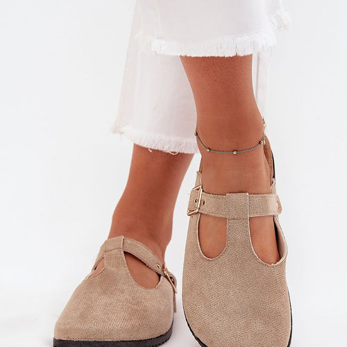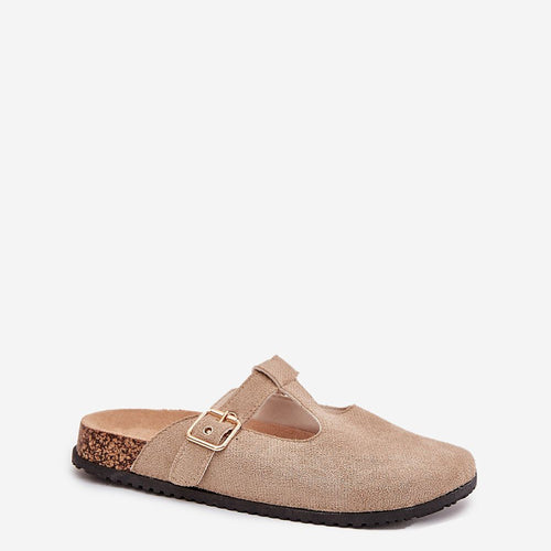 Stylish women's sandals with cutouts on a cork sole. Made of eco suede, they have covered toes for greater protection, and an adjustable buckle allows for a perfect fit to the foot. Thanks to the contoured insole, they provide comfort throughout the day. These sandals are perfect for everyday wear, combining comfort with fashionable style. fabric imitation leather suede Footbed...