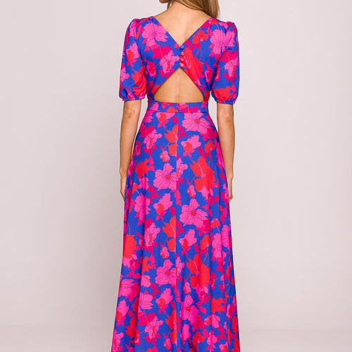 Dress made of delicate fabric with a matte finish, decorated with a multicolored, floral pattern that adds freshness and girlish charm. The model combines a fitted top with a flared bottom, which looks impressive thanks to the high slit, emphasizing the legs and giving the silhouette lightness. The front neckline is round and covered, while the back is adorned with...