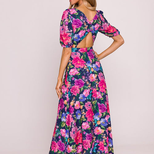 The dress is made of delicate fabric with a matte finish, decorated with a colorful, flowery pattern that adds freshness and girlish charm. The model combines a fitted top with a flared bottom, which looks spectacular thanks to the high slit, emphasizing the legs and giving the silhouette lightness. The front neckline is round and covered, while the back is...