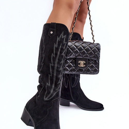 This model will steal the heart of many a lover of cowboy style boots! They will be perfect for autumn styling! Model made of nice eco-suede with delicate stitching on the upper. The boots are fastened with a zipper. Set on a low, stable heel. Insulated inside with shoe blanket. Pointed nose will optically slenderize the legs. The boots have...