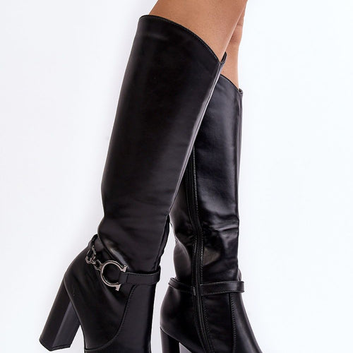 Elegant women's boots with an upper before the knee. Made of eco leather. Fastened with a zipper. Insulated inside with shoe blanket. Set on a heel in the form of a stable post. On the upper a thin belt with a decoration. Almond toes. You will use them in many stylings! fabric artificial leather warmers shoe cover Footbed shoe cover...
