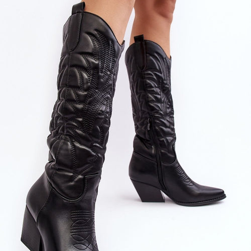 Women's over-the-knee boots made of eco leather. Set on a heel in the form of a low post. Pointed nose will optically slenderize the legs. The heel counter is stiffened. Soft insole will provide comfort during use. The upper is decorated with numerous stitches. Slip-on model with an additional zipper. Great for autumn styling! fabric artificial leather Footbed fabric Upper...
