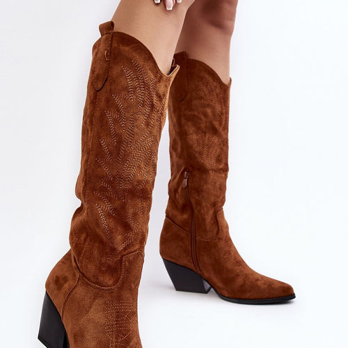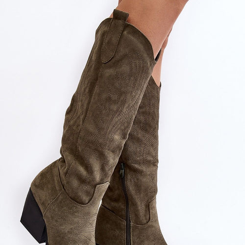 Women's over-the-knee boots made of eco-suede. Set on a heel in the form of a low post. Pointed nose will optically slenderize the legs. The heel counter is stiffened. Soft insole will provide comfort during use. The upper is decorated with numerous stitches. Slip-on model with an additional zipper. Great for autumn styling! fabric imitation leather suede Footbed fabric Upper...
