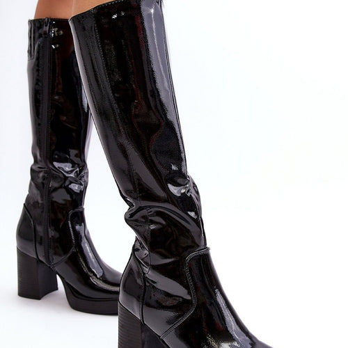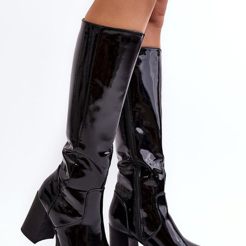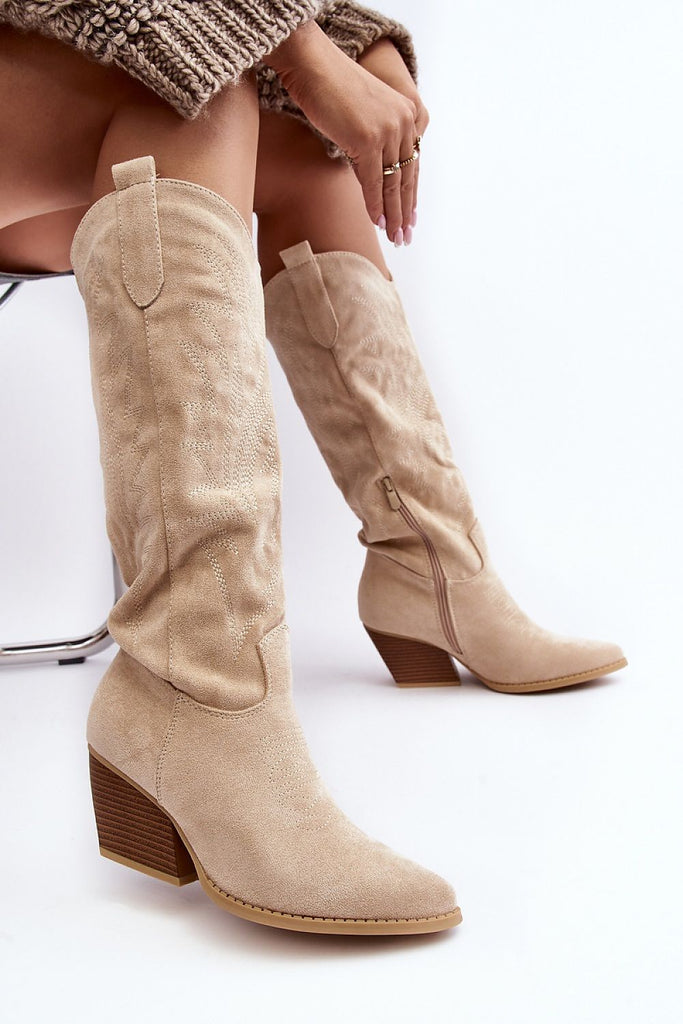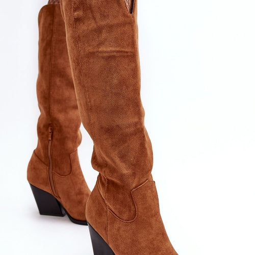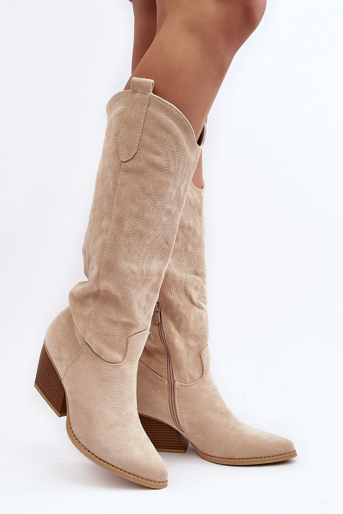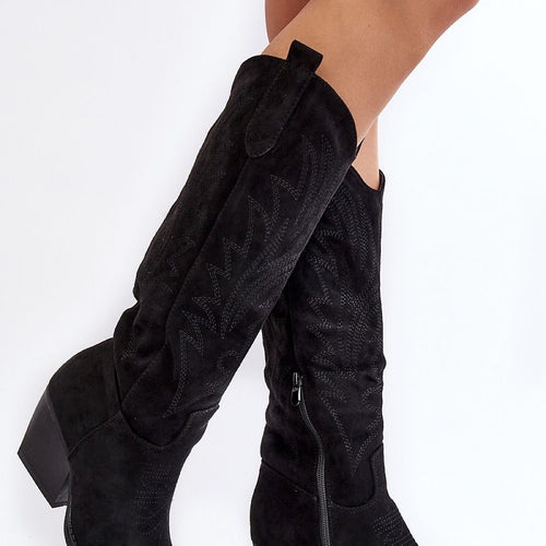 Women's boots with a high upper behind the knee. Set on a heel in the form of a stiletto. Made of eco-suede. A slip-on model with an additional zipper closure. Pointed nose will optically slenderize the legs. Interior lightly insulated with a nice-to-touch shoe blanket. The heel counter is stiffened. Upper decorated with stitching and rhinestones. You must have this...