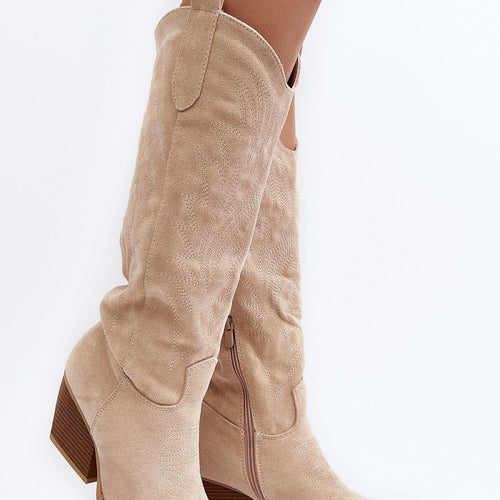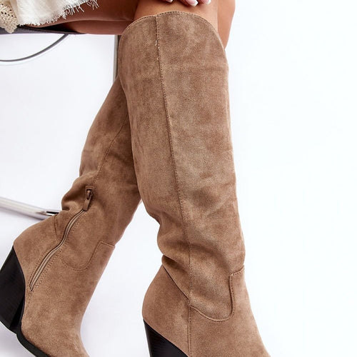 Women's over-the-knee boots made of eco-suede. Set on a heel in the form of a low post. Pointed nose will optically slenderize the legs. The heel counter is stiffened. Soft insole will provide comfort during use. The upper is decorated with numerous stitches. Slip-on model with an additional zipper. Great for autumn styling! fabric imitation leather suede Footbed fabric Upper...