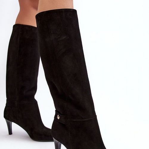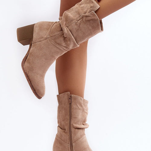 The boots perfectly emphasize the legs, so they will look perfect with dresses or skirts. These boots are extremely comfortable to wear. They are the ones that should find their way into your closet! Made of eco-suede. This model is slip-on and partially zippered on the inside of the upper. This model is set on a heel in the form...