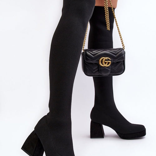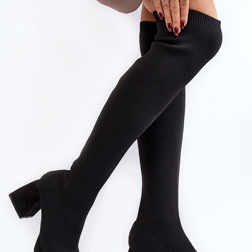 Women's boots made of textile material. They have an upper past the knee. Slip-on model with a square toe. Set on a platform and a block heel. Stiffened heel counter. Lightly profiled insole made of eco leather will provide comfort during use. Great for short skirts or dresses. These boots must be yours! fabric fabric Footbed artificial leather Upper height...