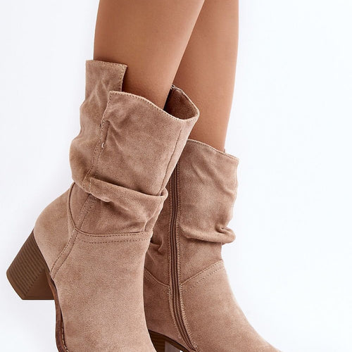 Women's boots with a crinkle upper for the ankle. Made of eco-suede. Set on a heel in the form of a post. Almond toes. Interior insulated with shoe blanket. Zippered at the side. You can match this model to many stylings. You should definitely have them! fabric imitation leather suede warmers shoe cover Footbed shoe cover Upper height 23 cm...