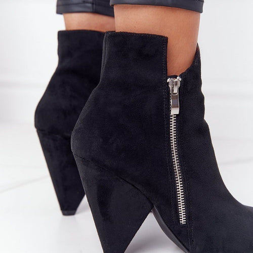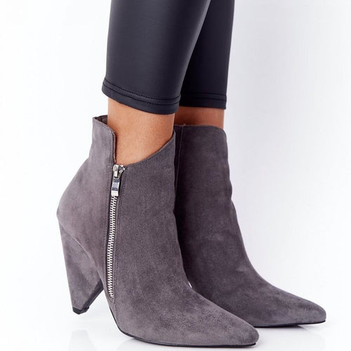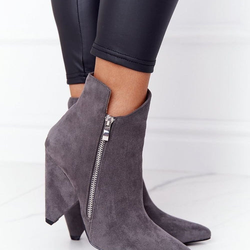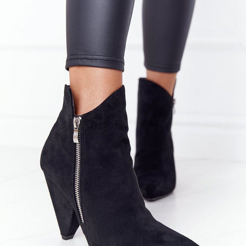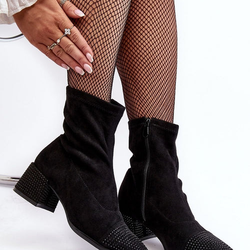 Women's boots with ankle-length upper. Made of eco-suede. Set on a low, rhinestone-decorated heel. Zippered closure. Rounded toes. The inside is insulated with shoe blanket only at the height of the foot. Classic model, perfect for many autumn stylings! fabric imitation leather suede Footbed shoe cover Upper height 16 cm Heel height 5.5 cm Size Insole lenght 36 23.5 cm...