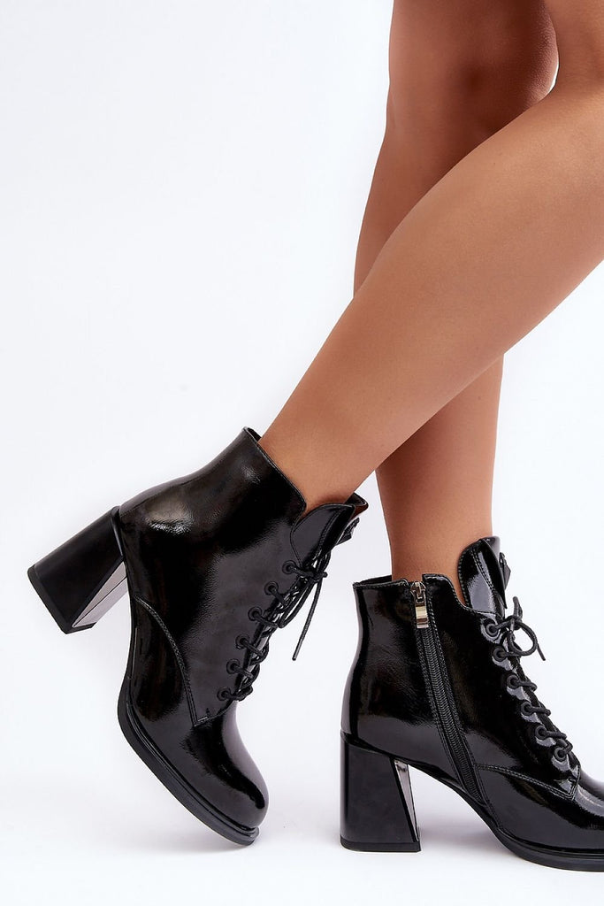 Women's boots set on a heel with a mirrored element. Made of eco leather. Zippered and laced. Ankle length upper. A small ornament on the tongue. Rounded toes. The inside is insulated with shoe blanket. You should definitely have them! fabric artificial leather warmers shoe cover Footbed shoe cover Upper height 10 cm Heel height 7.5 cm Size Insole lenght...