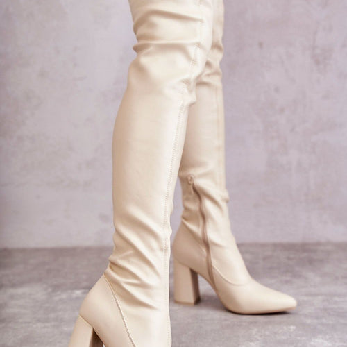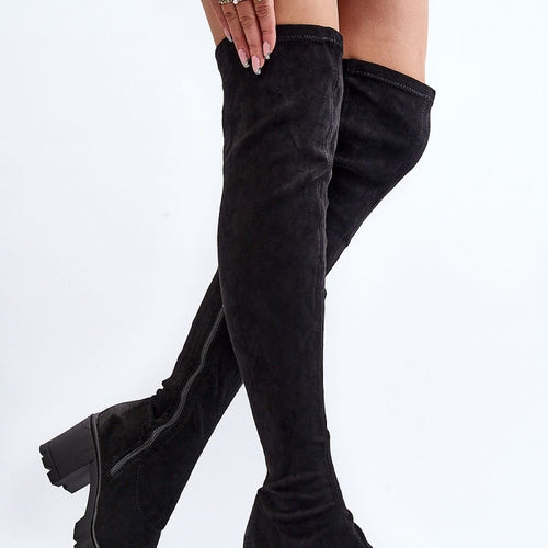 Classic boots with a distinctive lower, stiffer part of the upper. Made of eco leather. Slip-on model with a zipper on the side of the upper. Pointed nose and heel in the form of a post optically slenderize the legs. The insole in these shoes is insulated with a shoe blanket. Cut with an upper behind the knee. fabric artificial...