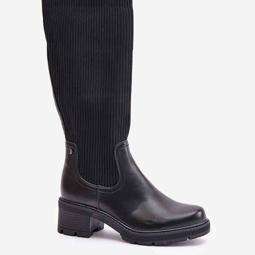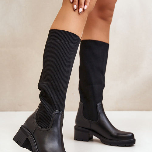 Women's knee-high boots with elastic shaft. Made of a combination of eco leather and textile material. Set on a block heel. Slip-on model. You will use them in many stylizations! They must be yours! fabric ~tkanina plus skóra ekologiczna Footbed artificial leather Upper height 35.5 cm Heel height 5.5 cm Size Insole lenght 36 24 cm 37 24.5 cm 38...