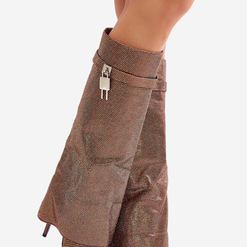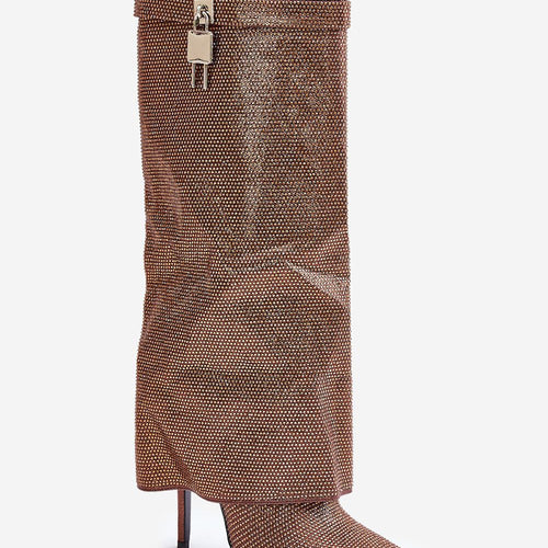 Unique slip-on boots for women who want to stand out! Made of fabric, they feature a turned-up upper decorated with rhinestones resembling zircons. Set on a stiletto heel. The interior is insulated with a pleasant-to-the-touch shoe blanket. The heel counter is stiffened, which guarantees proper stabilization of the foot. This model will certainly add glamour to your styling! fabric fabric...
