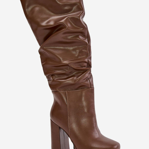 Women's boots made of ecological leather. Set on a platform with a post heel, they guarantee stability and an elegant look. The model is slip-on, with rounded toes. Characteristic for this model is the crease on the upper. fabric artificial leather warmers shoe cover Footbed shoe cover Upper height 42 cm Heel height 12.5 cm Platform height 3.5 cm Size...