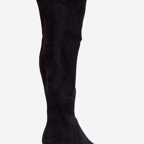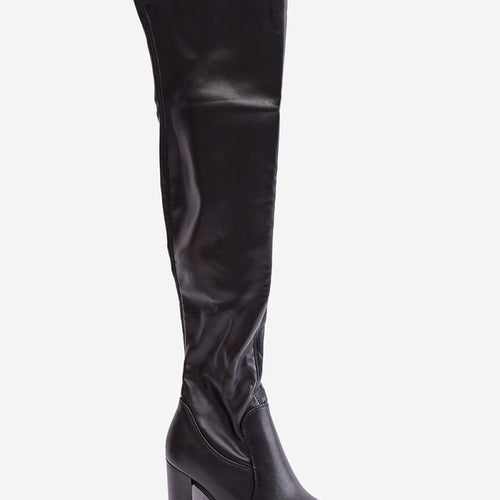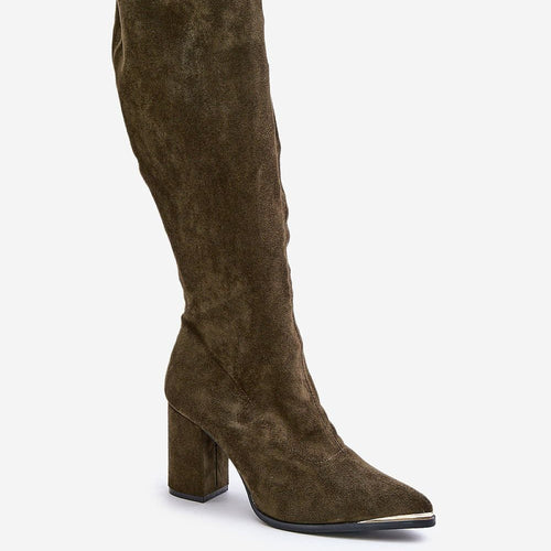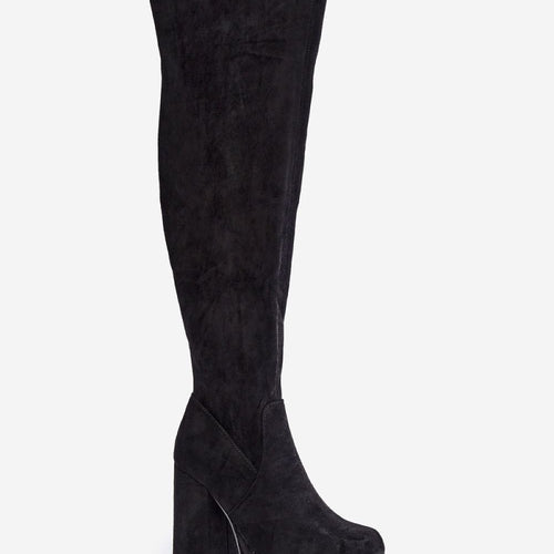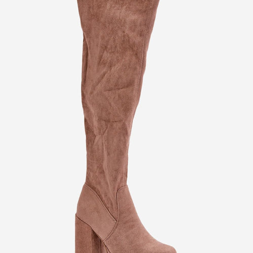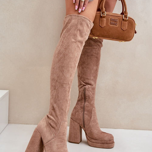 Stylish women's boots with an upper reaching beyond the knee. Made of ecological suede. Set on a low block heel. Rounded toe caps. Slip-on model with an additional zipper. Insulated with a shoe blanket only at the height of the foot. Upper decorated with stitching. Perfect for mini dresses or skirts. An essential part of your closet! fabric imitation leather...