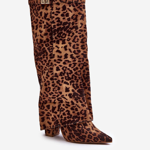 Stylish women's boots made of eco suede. Set on a pillar-shaped heel. Pointed toes. The inside is lined with shoe lining. The main advantage of this model is the folded shaft adorned with gold buckles. Slip-on model with an additional zipper at the bottom. They will be perfect for outfits with loose blazers, skirts, and dresses! You definitely should have...