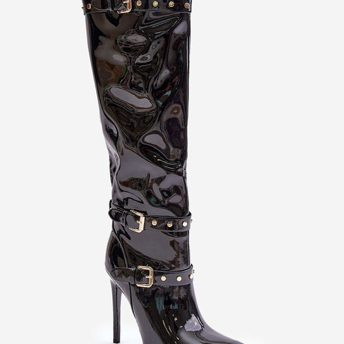 Elegant women's stiletto heeled boots made of lacquered eco leather, which impress with a stylish design and careful finishing. The zippered model, with pointed toe, set on a slender stiletto heel, perfectly elongates the silhouette and adds a chic touch. The upper decorated with straps with buckles gives them a unique character, creating a fashionable and distinctive accent. Perfect for...