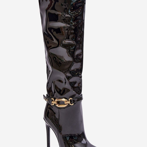 Elegant women's boots made of lacquered eco leather are the perfect choice for special occasions. The zippered model, with pointed toe and set on a slender stiletto heel, gives the silhouette a unique lightness and style. A decorative strap with a gold accent on the upper adds distinction, while subtle warming provides comfort during colder days. A stylish cut that...