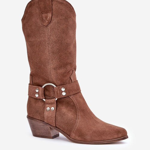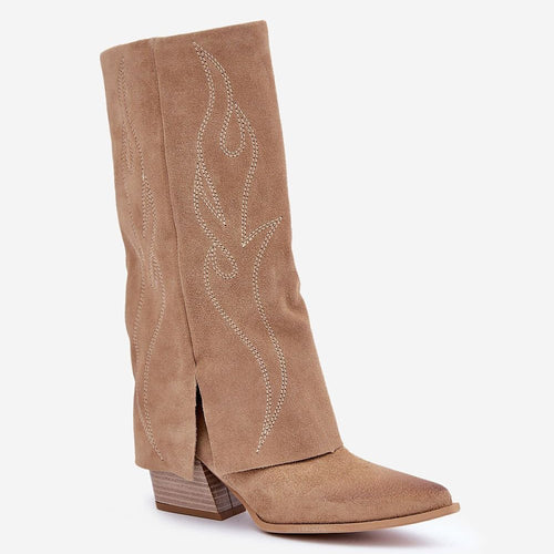 Natural suede cowboy boots are a stylish choice for women who appreciate classics with a touch of character. Set on a low heel. They have a contoured, pointed nose, which adds to their distinctiveness. The zippered model makes it easy to put on, and the interior insulated with a shoe blanket provides warmth during colder days. These suede boots go...