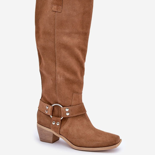 Women's boots made of eco suede. Slip-on model with an additional zipper at the bottom for easy putting on and taking off. Pointed toes visually slim the legs, and the rolled shaft with embellishment adds a unique character. Stylish and unique, perfect for fashionable stylizations. fabric imitation leather suede Footbed fabric Upper height 35.5 cm Heel height 8.5 cm Size...