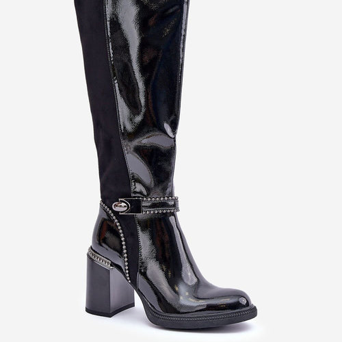 Exceptional stiletto boots made of patent eco leather, which catch the eye with their elegant and striking style. Zippered model, with warming to ensure comfort during colder days. Pointed noses add slenderness, and a decorative belt with a large silver buckle, creating a distinctive and fashionable accent. Ideal for evening and elegant outfits, these boots combine comfort and original design....